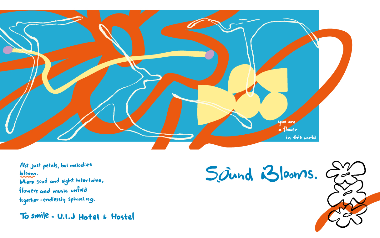 U.I.J Hotel & Hostel 友愛街旅館(以下簡稱 U.I.J),2025 年秋季,跨國邀請來自泰國曼谷的人氣刺青藝術家 To smile 共同展開全新藝術企劃《Sound Blooms》,重新詮釋藝術家 To smile個人經典設計 icon「花 Flower」,讓旅館化身一座能「聽見花開」的沉浸式聲音花園,以鮮明色彩與富有玩味的筆觸,轉化為既自然又帶有強烈個人風格的視覺律動,讓聲音在畫面中搖曳生長,如花綻放般地蔓延至心底。自即日起持續至 2026 年 1 月 25 日,邀請觀者走進花與樂曲交錯的節奏裡,探索「美如何在瞬間綻放」的回應。