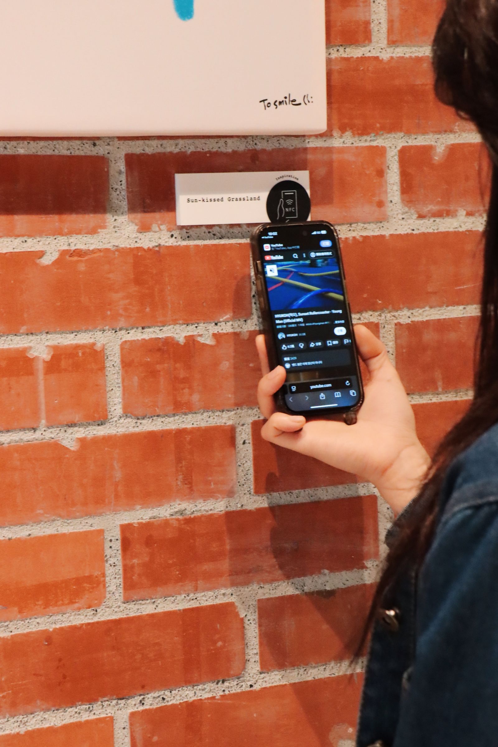 旅程的起點,始於 1 樓大廳的黑膠主題牆。To smile 以 9 片二手黑膠唱片為載體,手繪上獨特的花朵符號,打造出一座隨旋律轉動的視覺裝置,具象化了「聲音的流動」與「視覺的綻放」。