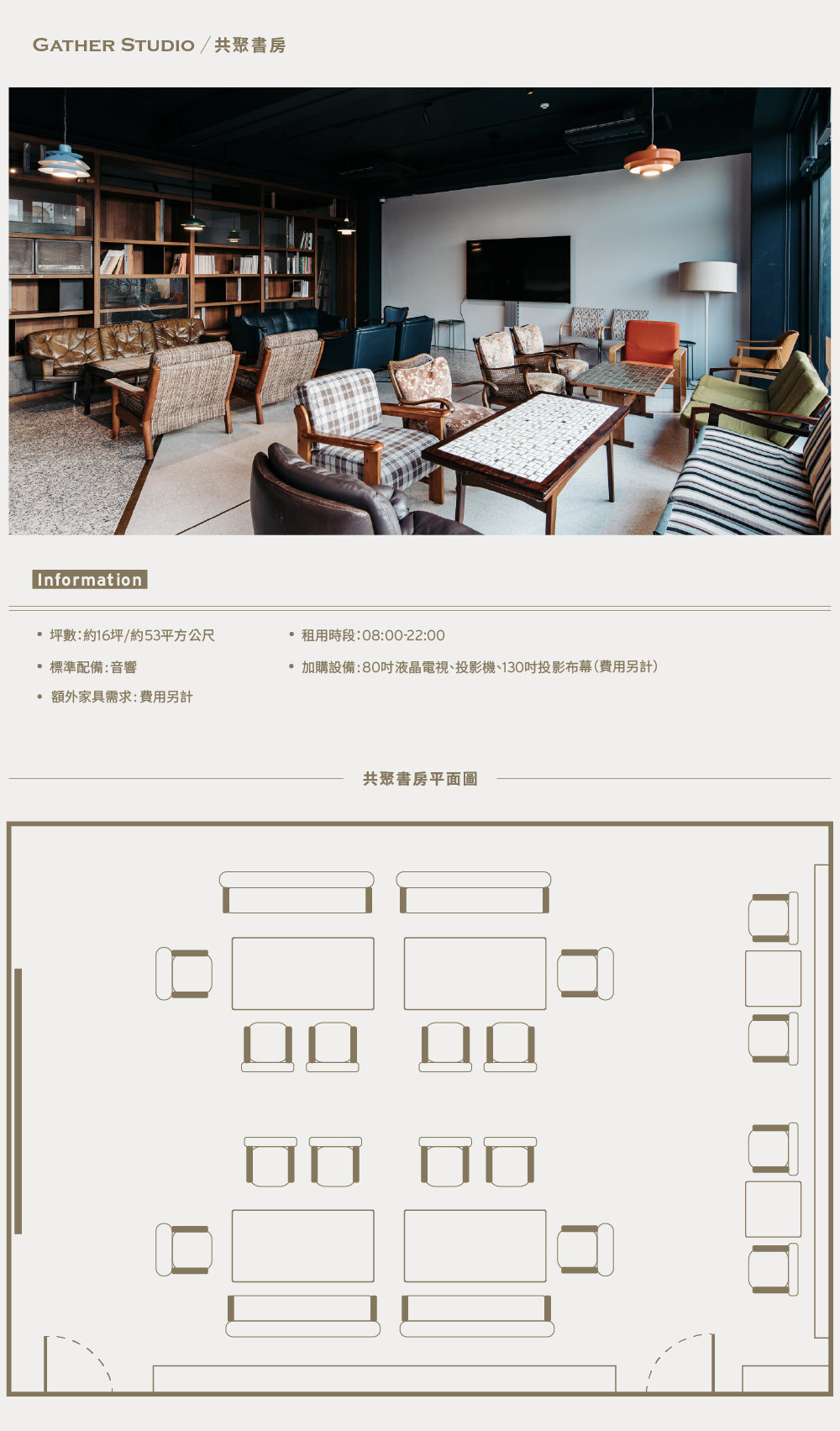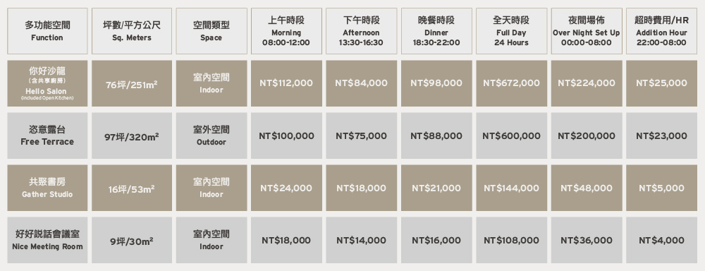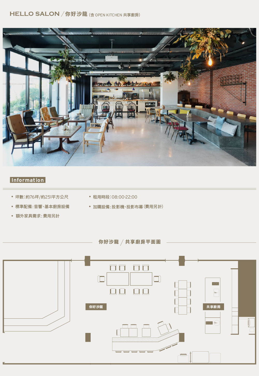 開闊明亮的你好沙龍和共享廚房、浪漫的恣意露臺、獨立的共聚書房,無論是會議、派對、婚禮、品牌發表會、烹飪課程、商業攝影,都能與您一同討論客製,靈活規劃每一場重要活動!
