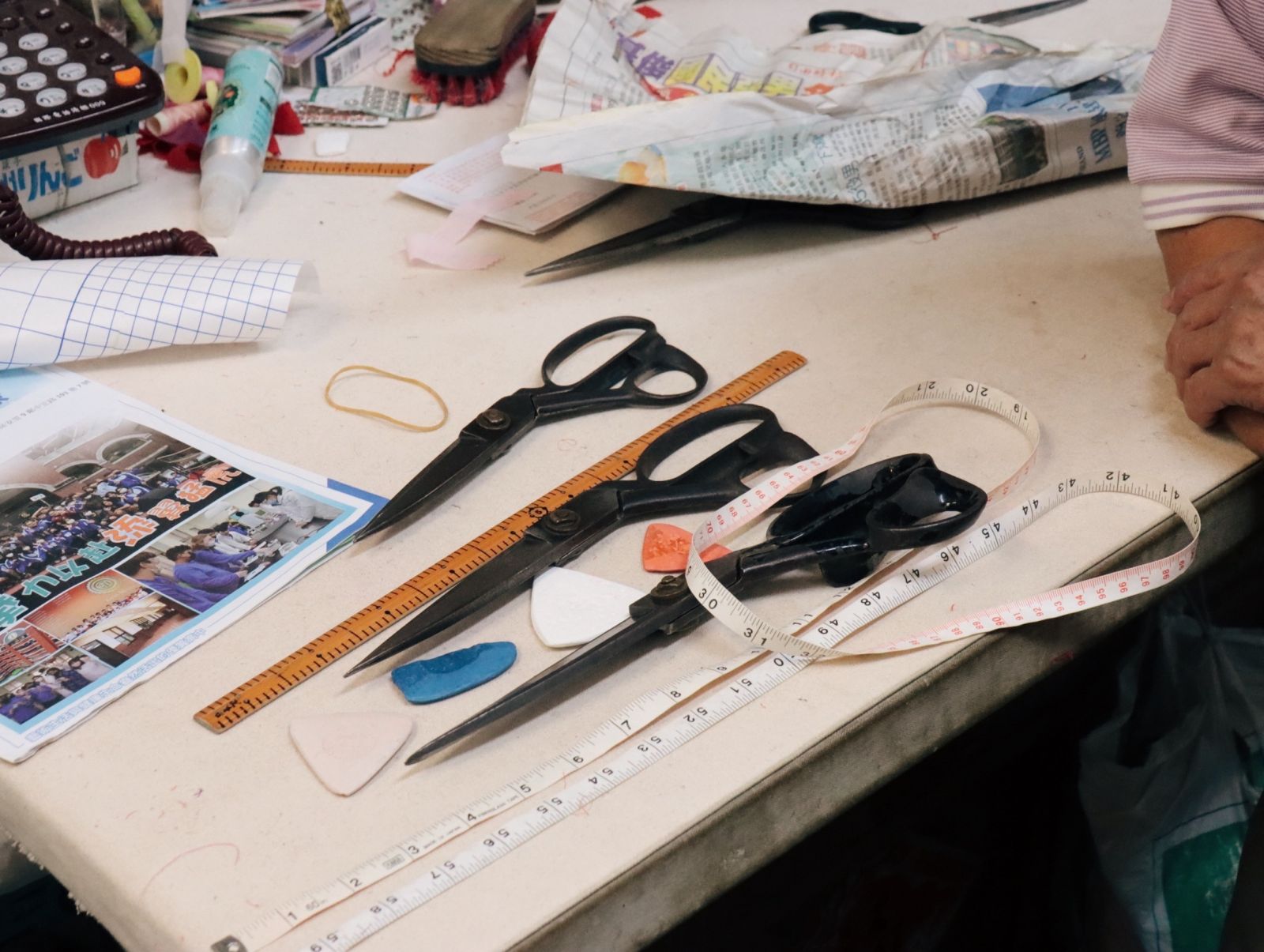 如今,鄭老闆只接受少量訂製,並積極參與教學,擔任國服比賽的指導老師。他走到工作臺旁,拿起布尺、短尺、粉片、剪刀和針,輕聲說:「做旗袍需要的 不僅是技術,還有耐心。」