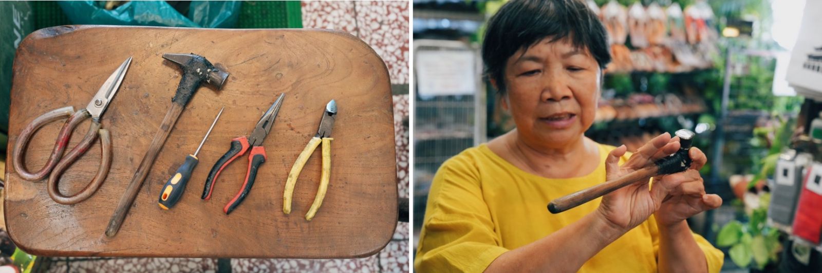 對於老闆娘來說又屬一支鐵鎚最具代表性,從第一代的婆婆使用到第四代,經過百年的時光,連握把都逐漸變細,在持續百年的敲打聲中,門口以木屐形狀的招牌上刻著「聆聽腳下」,短短一句話道出的是家族對木屐這項傳統工藝背後的期許。